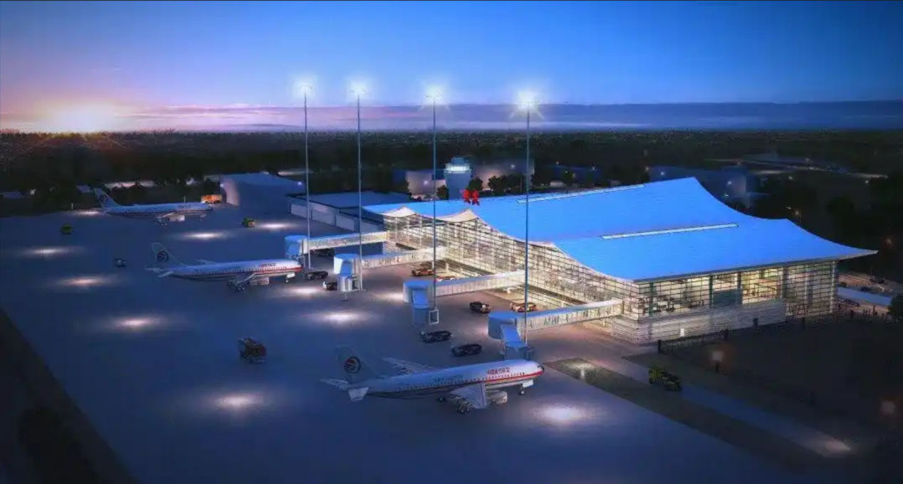 工程概况:新建航站楼约13845平方米,本工程建筑层数为地上二层,二层下部是现浇钢筋混凝土框架结构,二层上部是大跨度钢结构;建筑高度为23.1M,设计主要范围为:候机楼及附属配套用房工程,另外还包含2个登机桥,且有两个登机口为远期登机桥预留。